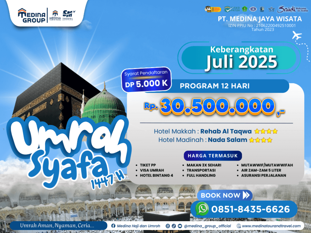 - Pembatalan 4 Minggu sebelum keberangkatan 25% dari Harga Umrah