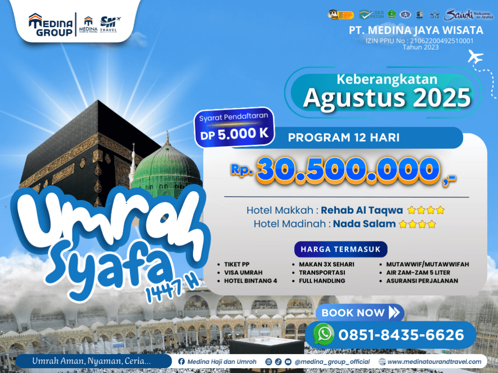- Pembatalan 4 Minggu sebelum keberangkatan 25% dari Harga Umrah